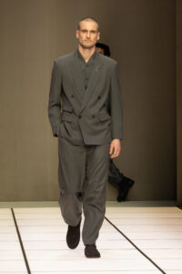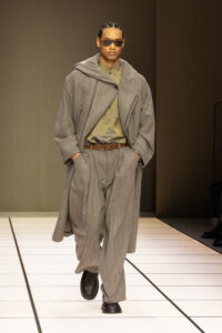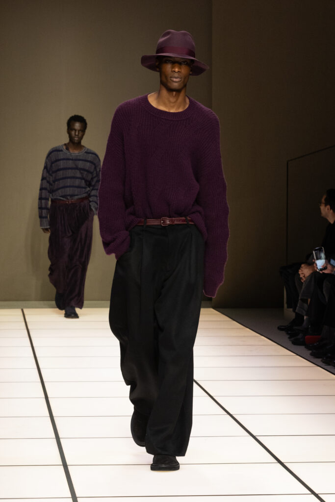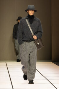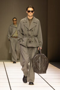 系列中另一亮點,是與意大利新晉羊絨品牌Alanui的合作。這是Alanui成立10週年的慶祝之作,一起推出中性幾何提花開衫,柔軟的針織單品以流蘇邊緣與幾何圖騰裝飾,成為全場最富紋理的焦點。光澤與啞光的材質碰撞,彷彿在呼應主題的哲思:表象與本質的相互映照,創造出層次豐富的獨特和諧。這場秀是對創辦人的致敬,他的鬆弛剪裁與奢華觸感透過iridescent 元素,注入年輕活力。秀場尾聲以幾組情侶同款登場,甚至融入少數女裝look,強調Armani 先生早年開創的先鋒精神,在新時代重現光彩。