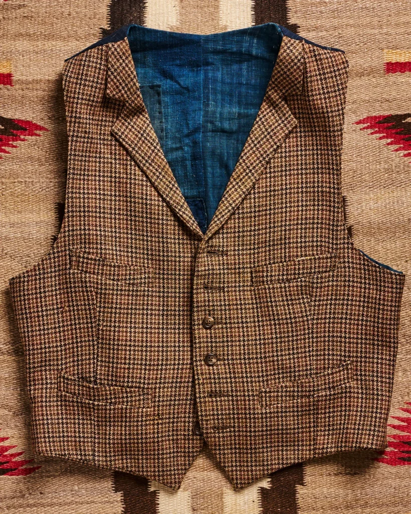 這件背心如果還有袖子的話,現在會很值錢,因為它又是一件大概在 1920 至 1930 年代誕生的作品。我這件其實是從復古經銷商 Brit Eaton 購入的。90 年代我去了他位於科羅拉多州的家,這件單品原本是他的,我記得我是從他的衣櫃裡尋找出來的,當時我隨身攜帶的郵差包壞了,Brit 就給了我一枚警察徽章,讓我用來修補包包,那枚徽章這次也一起在拍賣清單裡。