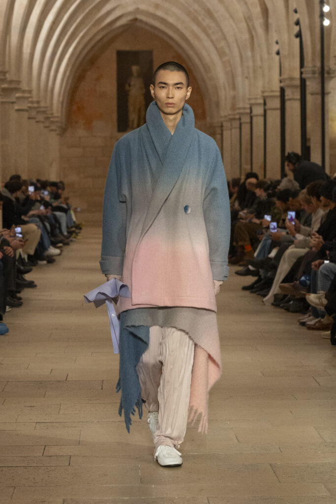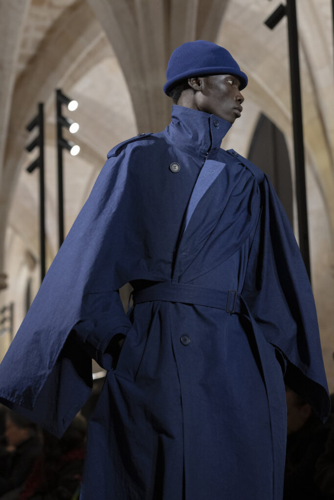 本季色調以「天空從黎明到黃昏的轉變」為主題。在一天中那短暫的時刻,光與色交疊之際,我感受到緊張與平靜、靜止與振奮同時存在的感覺。 色彩在系列後半段變得更強烈,是為了在服裝中表現這段時間的流逝。然而,重點並不在顏色本身,而是顏色如何與材質的質感、布料的動態產生共鳴;由於結構與形式極為簡單,色彩就像情感或存在感一樣,透過穿著者的身體與動作而鮮活起來,這種留給觀眾詮釋空間的用色方式,應該就是塑造本季氛圍的一大關鍵。