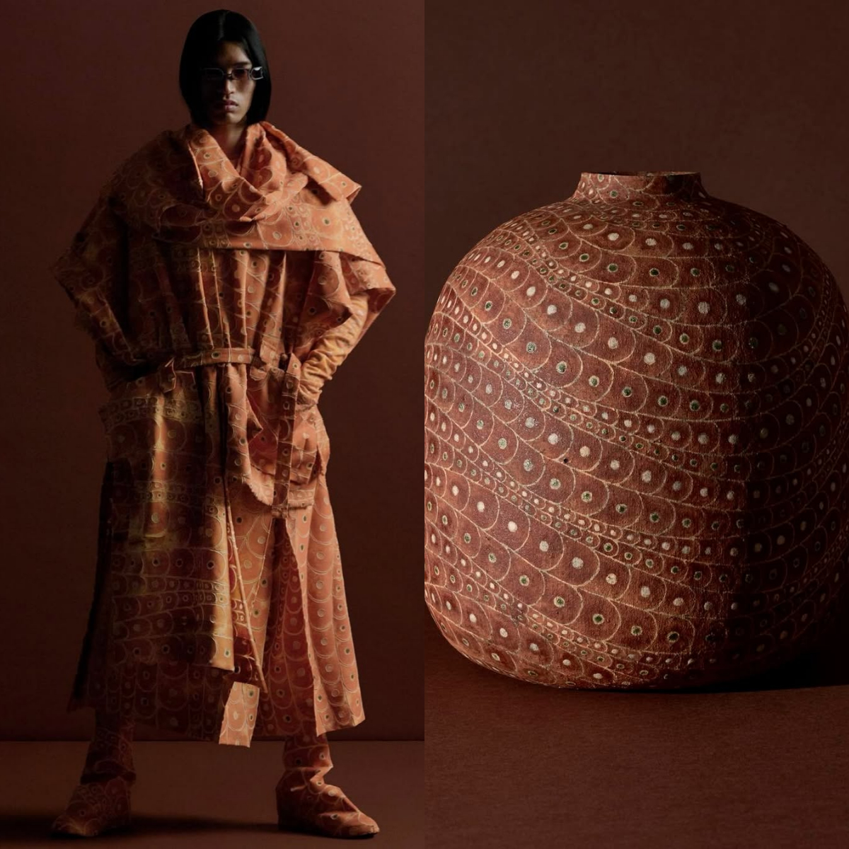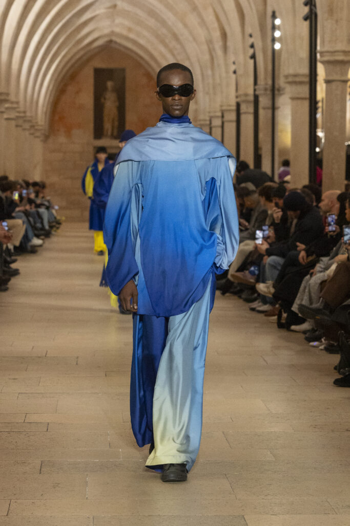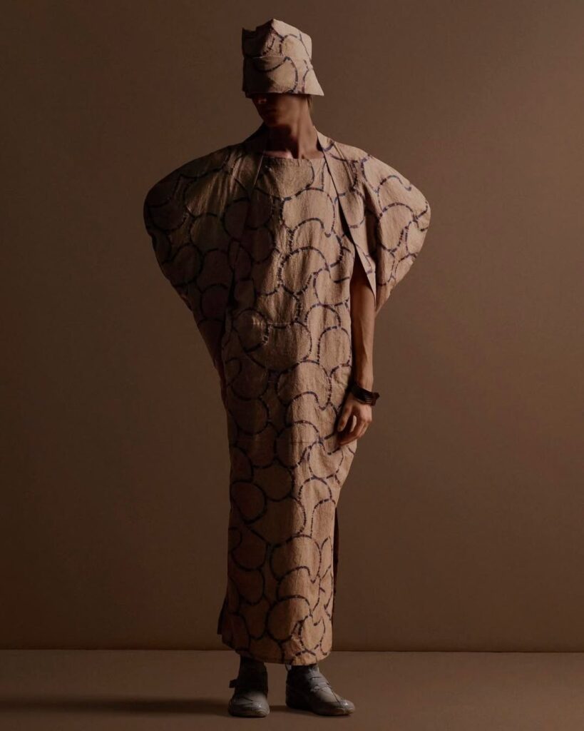 「DAWN」系列是本季的象徵。這聚焦了日本染色技法中「隨時間層層疊加顏色」的過程。不是一次決定顏色,而是擁抱漸層與色調的變化,讓表現緩慢地發展。這種方式與本季主題(捕捉天空轉瞬即逝的時刻)產生共鳴。我們並不把傳統工藝視為對過去風格的重現,而是視為「一塊布」哲學的延伸,盡可能保持結構簡單,將染色過程中產生的偶然性與深度,帶到服裝的最前線。因為我們關注的重點不是技法本身,而是將其中蘊含的時間感與自然關係,轉化為當代設計思維,創造出能自然與人的身體及日常生活相融的表現。
