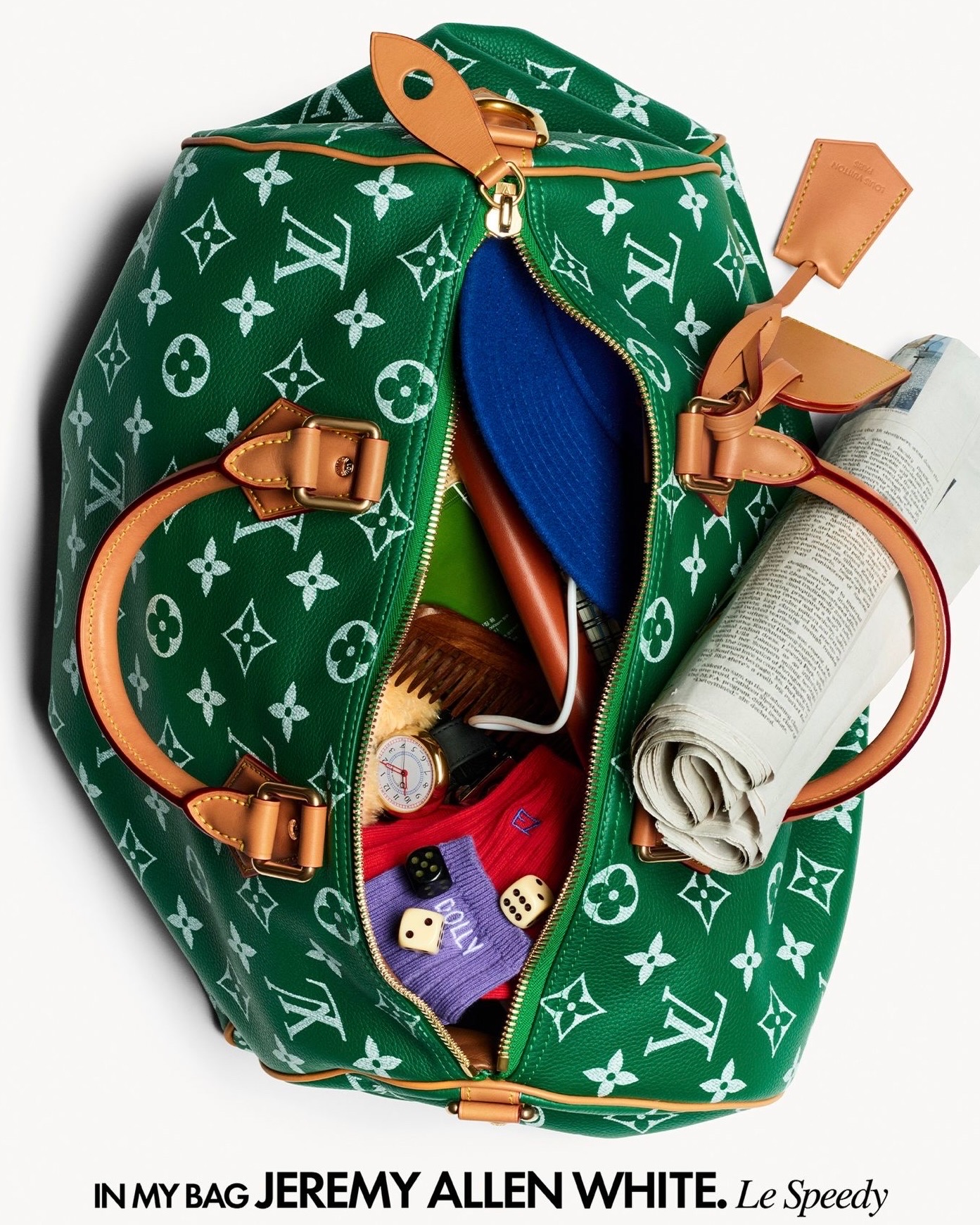 在由 Thomas Lagrange 掌鏡的廣告特輯中,每個 Speedy P9 都化身為主角的個人寫照。品牌大使兼金球獎得主 Jeremy Allen White 的綠色 Speedy P9 款內,放著當日報紙、筆記簿、闊邊帽、梳子、腕錶、骰子、襪子與充電線,散發隨性文青氣息;英國足球天才 Jude Bellingham 的紅色 Speedy P9 則盛載飛行眼鏡、機票、護照、球衣、Ombre Nomade 香水及訂製鎖匙扣,展現國際運動員的旅人風範。