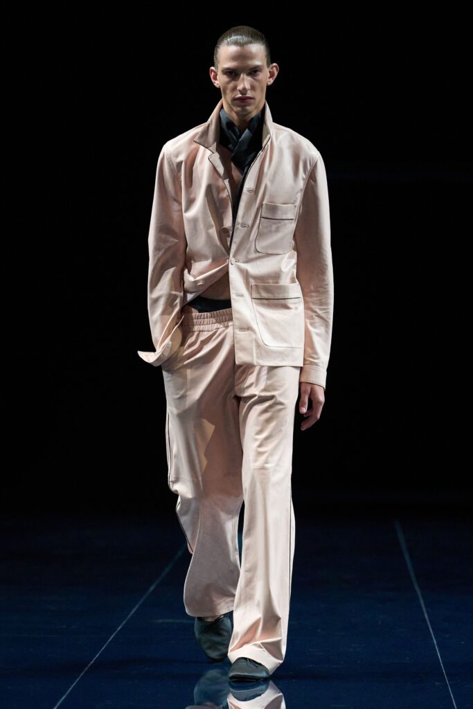 其他品牌同樣擁抱這股風潮。Zegna 以精緻羊毛與絲混紡打造柔軟卻有型的睡衣式西裝,Emporio Armani 則推出絲質吸煙外套,繫上腰帶如睡袍般舒適而優雅。Amiri 帶來更街頭化的版本,結合緞面與運動元素;Tom Ford 則以流暢剪裁,剋意保留一絲性感權力感。這些設計共同的特點是輕盈觸感——絲綢的滑順、透氣的棉質或是緞面的光澤,讓穿著者無論身處任合場合,都能維持舒適感。