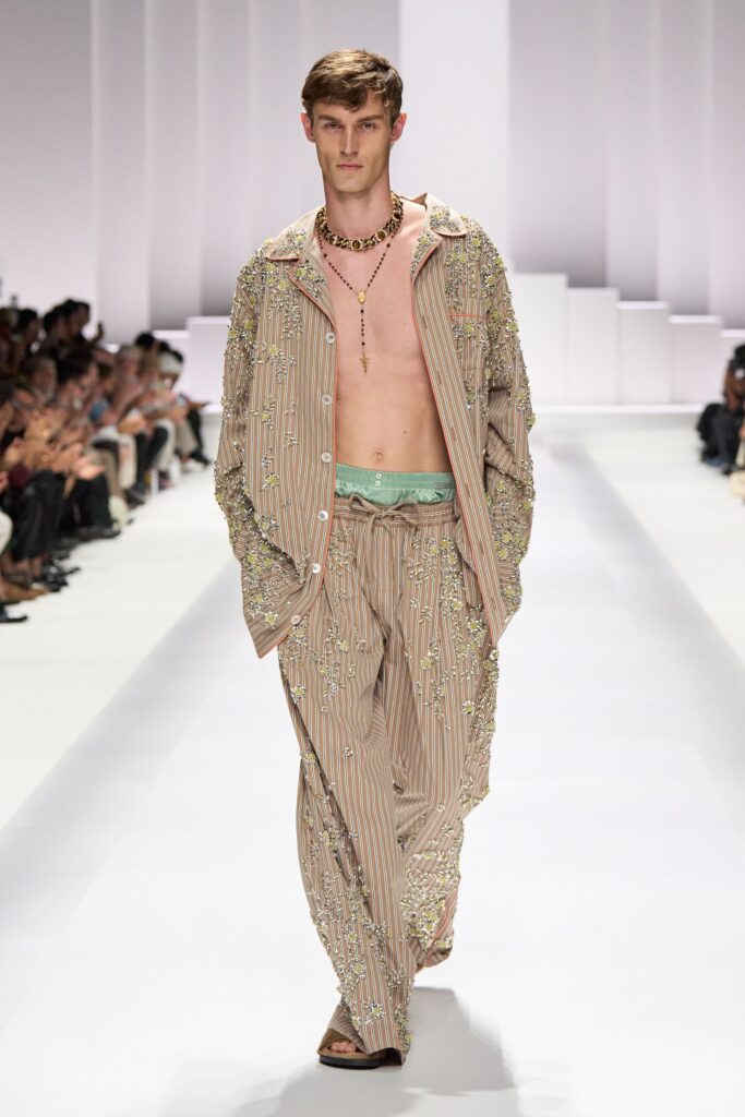 Dolce & Gabbana 這季將經典睡衣重新詮釋為街頭與派對主角。寬鬆的條紋棉質睡衣套裝、皺褶自然的面料、彈性腰帶或緞帶腰封若隱若現,搭配針織開襟衫、西裝外套甚至領帶,創造出意外和諧的層次效果。模特兒腳踩毛絨拖鞋或室內拖,卻散發出意大利式的輕鬆優雅,從室內走到街頭都毫不違和。這不僅是復刻品牌 90 年代的睡衣 DNA,更是對當代生活態度的宣言:為何要把最舒服的衣服只留給睡覺?