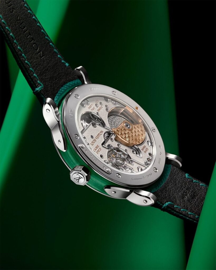 圍繞寶石錶殼的,是鉑金錶圈、錶耳、底蓋及刻有品牌標誌的八角形錶冠,並以旅行箱鉚釘作為設計靈感,放在分鐘刻度及錶耳細節位。整體感覺是把 Louis Vuitton 旅行 DNA 帶入高級製錶世界。