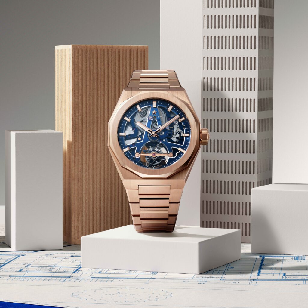 Zenith 的方向十分明確:一手緊握歷史,一手將現代 Defy 的線條推向更前衛的境地。Defy Revival A3643 承襲 1969 年原型錶的多切面錶殼與 14 邊形錶圈,37mm 尺寸搭配銀色錶盤,進一步放大拋光錶殼的光澤感,並搭載 Elite 670 機芯。另一亮點則是 Defy Skyline Tourbillon Skeleton:玫瑰金錶殼配以藍色鏤空錶盤,首次於 Skyline 系列中呈現鏤空陀飛輪,12 點至 6 點的橋板結構如中軸般將視線引向陀飛輪裝置。Zenith 此番策略頗具意味:復刻不單是懷舊,更是為了強化「深知自身本源」的底蘊;而 Skyline 鏤空陀飛輪則在提醒眾人,Zenith 仍致力以直接的技術展現,穩握話語權。