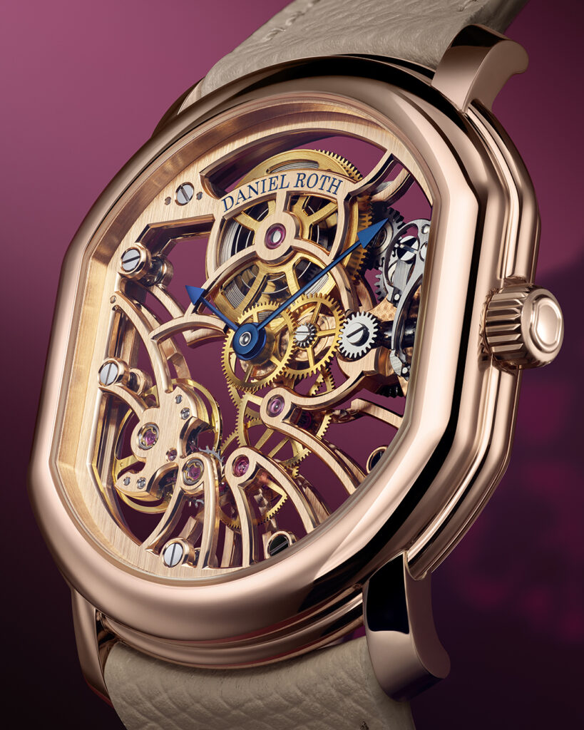 Daniel Roth 彰顯極致鏤空工藝的 Extra Plat Rose Gold Skeleton,僅保留支撐齒輪系、發條盒、擺輪與指針所需的橋板。