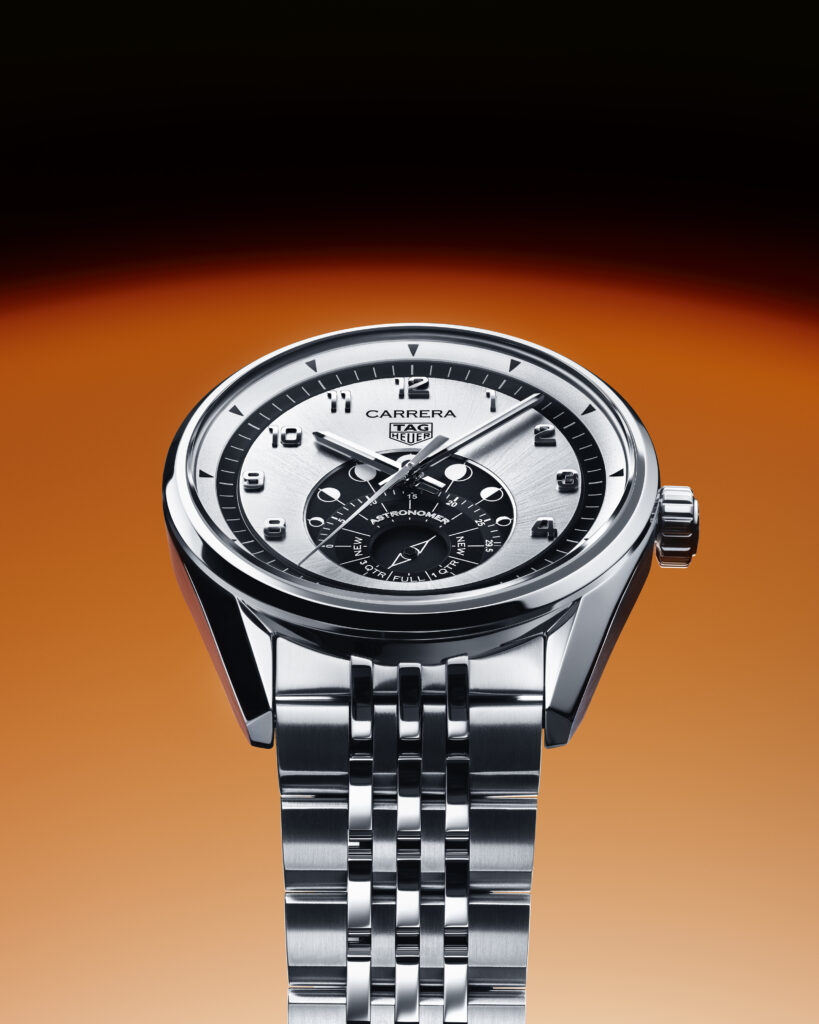 談及月相顯示,我們腦海中浮現的,多半是那在半圓視窗中悄然升起、又緩緩隱去的月亮圖案。然而,TAG Heuer 在 Carrera Astronomer 上,選擇以更貼近天文觀測儀器的方式,重新詮釋這項功能。錶盤下方的弧形刻度與纖細指針,精準描繪出月亮 29.53 天的運行軌跡,每日凌晨悄然推進一格,彷彿默默為我們記錄月球在星空中的每一步履。這種呈現方式既直觀又充滿科學氣息,也促使我們重新思考月相的意義:它不僅是裝飾,更是將宇宙的秩序凝縮於方寸之間,讓配戴者在日常中,依然能與浩瀚星空保持聯繫。