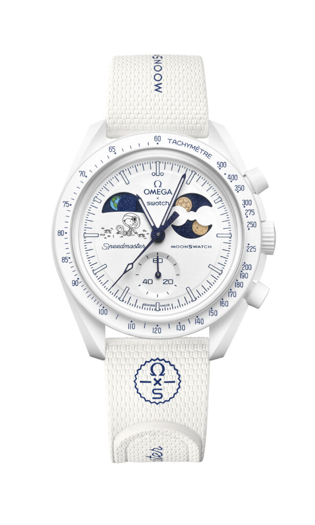 2025 年,兩大品牌再推重量級新作——「MISSION TO EARTHPHASE MOONSHINE GOLD」,為 MoonSwatch 系列注入令人目眩的金色光芒,每款腕錶皆採用獨特設計,首創「地球相位顯示」(Earth Phase),並搭配鑲嵌 OMEGA 獨家 Moonshine™ Gold 的璀璨月相盤,以及融入 Snoopy 宇宙的趣味插圖,更特別的是,每款錶作的月相盤都擁有專屬細節與故事靈感,全部對應不同月份的真實滿月,讓佩戴者每個月都能與天文奇景產生連結。