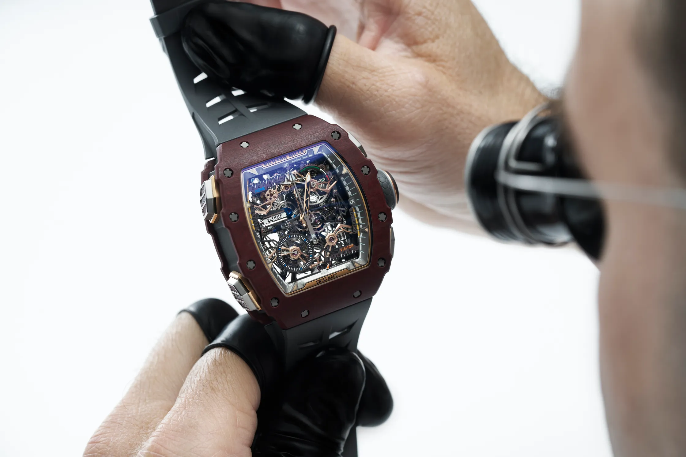 作為 Richard Mille 出品,規格自然毫不保留。品牌耗時 5 年研發全新手動上鏈機芯,採用 Grade 5 鈦金屬製造,配備雙導柱輪設計、70 小時動力儲存,以及多重防震與防磁保護,即使看台氣氛再熱烈,或(萬一)不慎在掉到地板上,也能應付。整枚機芯高度鏤空,約 650 枚零件透過藍寶石水晶錶盤與底蓋清晰呈現,結構一覽無遺。