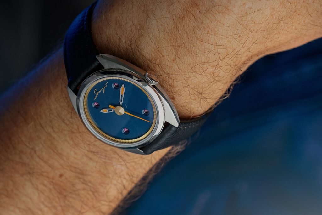 Caballero 系列提供黑、藍、綠三種錶盤選擇,每一種顏色都被賦予了深沉的性格:黑色是經典永恆的基底,象徵紳士的穩重與深邃;藍色則帶有一絲理性與寧靜,猶如地中海午後的天空;綠色最為微妙,它復古、內斂且充滿生命力,彷彿經典跑車車庫中光影下的金屬漆面。錶盤布局極致簡潔,捨棄了多餘的刻度與副盤,將所有視覺焦點留給指針與時間本身。這種「減法」設計,需要對比例與平衡有絕對的把握,否則便會流於空洞。然而,Singer Reimagined 便做到了——指針的形狀、長度,乃至時標字體的細微弧度,都經過精密計算,確保在極簡中達成最高的視讀性與和諧感。