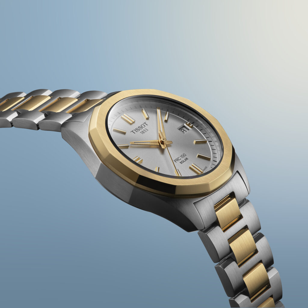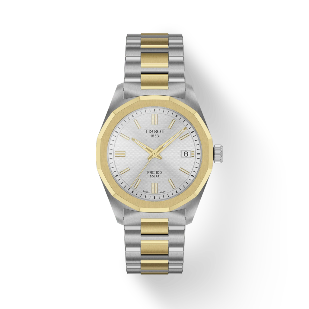 Tissot 最新 PRC 100 Solar 34mm 雙色黃金 PVD 款,以銀色錶盤和同色時標,呈現精緻比例。