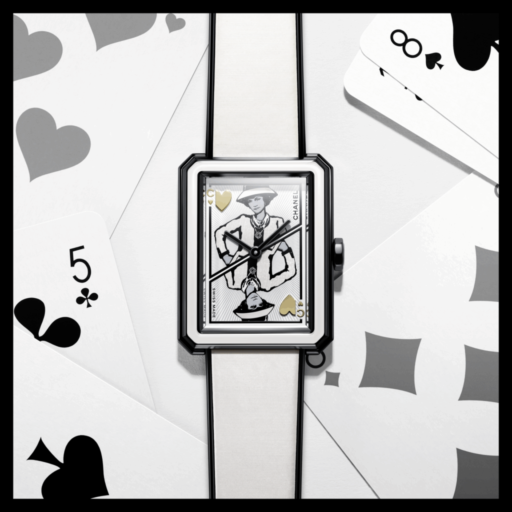 當中,J12 Coco Game 腕錶把 Mademoiselle 變成秒針上的角色,以碳纖維材質製作,兼顧輕量與穩定;Boy·Friend 則以撲克牌為概念,將 Chanel 女士化為紅心皇后;長項鏈錶更把時間隱藏於背面設計之中,強調「時間可被隱藏」的概念。
