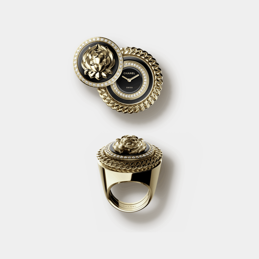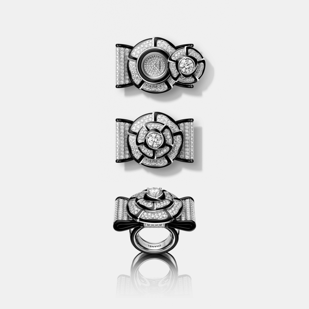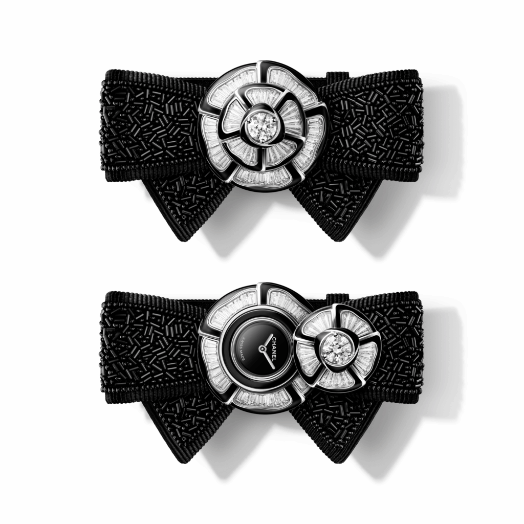Noeud de Camelia 為全新系列,以山茶花與蝴蝶結為設計核心,延續 CHANEL 一貫黑白配色。系列包括 4 款腕錶及一枚戒指錶,融合 Lesage 刺繡、雪花鑲嵌及立體結構設計,將高級訂製服工藝轉化為腕錶,設計重點在於質感與立體感,而非複雜機芯,定位更偏向珠寶時計。
