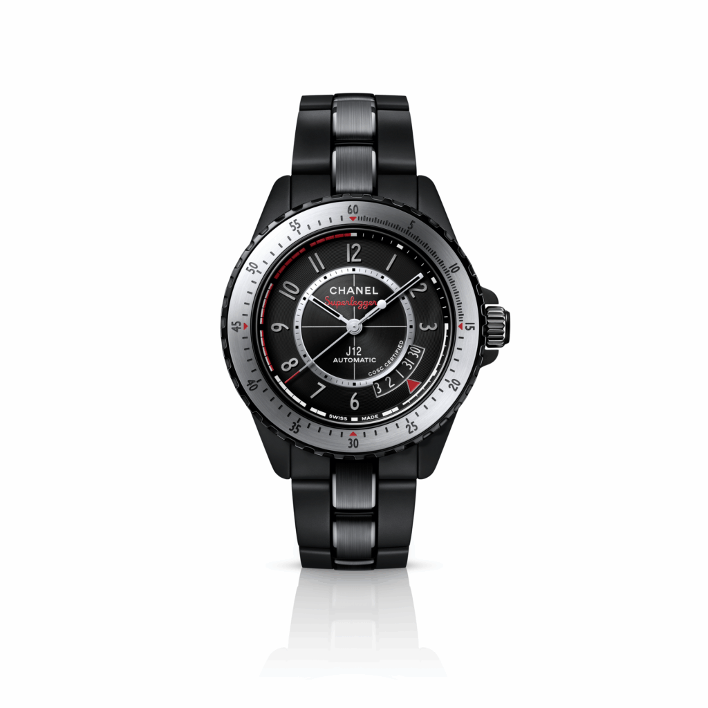 在 J12 42mm 系列之中,J12 Superleggera 是今年最具動感的一款 ,新作採用黑色啞面陶瓷結合精鋼結構,錶圈分層處理,上層為緞面打磨,下層經黑化處理並加入刻紋細節。黑色漆面錶盤配以圓形緞面與外圈蝸紋打磨,4 點鐘位置設有日期窗,並以紅色箭頭指示,提升辨識度。錶鏈則以陶瓷與緞面精鋼鏈節交織,整體風格更銳利,定位明確偏向運動腕錶。