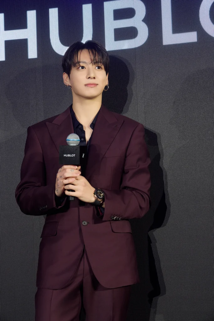 江南區活動現場當晚,這位流行巨星身穿了一件修身酒紅西裝,內搭敞開領口形態的黑色襯衫,腕上佩戴著璀璨的 Hublot King Gold Big Bang Unico。粉絲擠滿大樓周邊多條街道,縱然人群被保安隔在外面,但圍欄另一側的人同樣為之瘋狂。Jung Kook 走到哪裡,目光就跟到哪裡。他仔細觀賞展示的手錶,並在 DJ 強勁的節奏中親切回答了以下幾條提問。