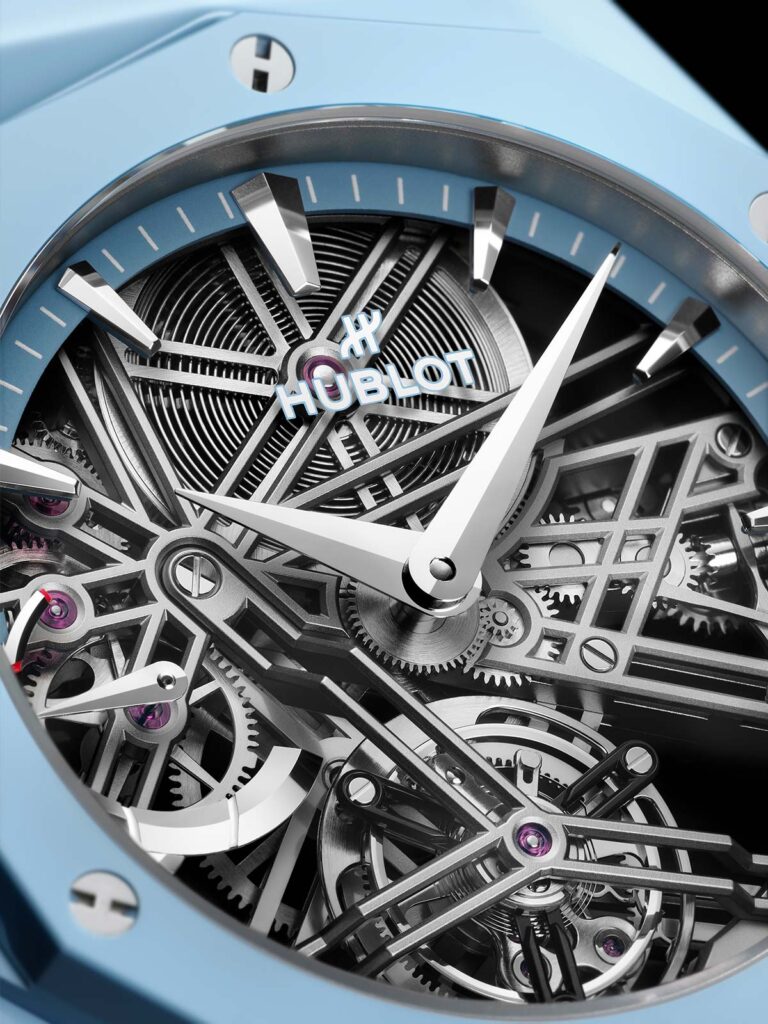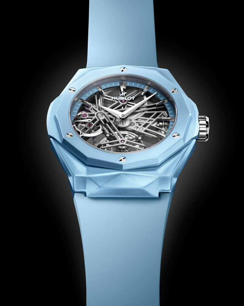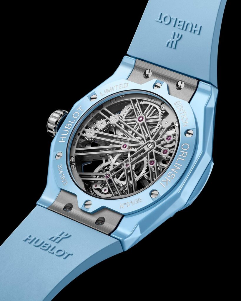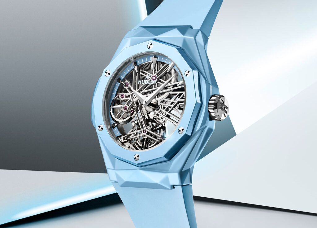 Hublot Classic Fusion Tourbillon Orlinski 於 2024 年推出,這是 Hublot 延續與法國知名雕塑藝術家 Richard Orlinski 的限量合作系列,包括鮮豔黃色(Vibrant Yellow)與天空藍(Sky Blue)兩款,各限量僅 30 枚。