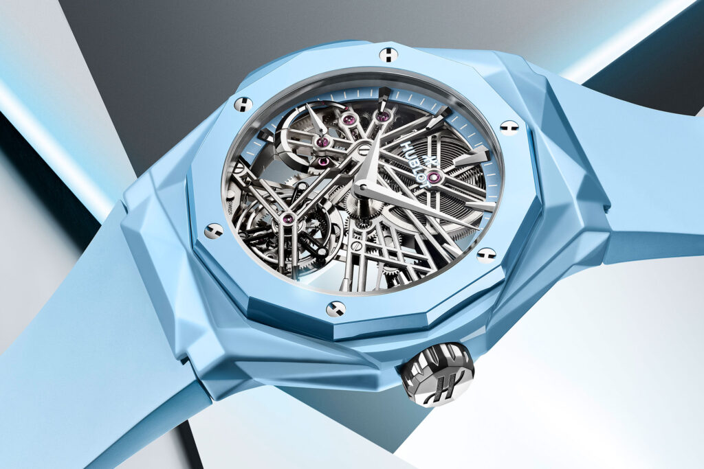 透過防反光藍寶石水晶鏡面,可清楚觀賞鏤空錶盤下的 HUB6021 手動上鍊陀飛輪機芯,提供長達 115 小時動力儲存。外露的橋板宛如藝術鷹架:天空藍版本採用銠鍍層處理,鮮豔黃色版本則以黑色 PVD 鍍層呈現,與錶圈上的六顆「H」螺絲設計完美呼應。在 8 至 9 點鐘位置設有動力儲存顯示——天空藍版為白色指針,鮮豔黃色版配備黃色指針;位於 6 點鐘位置的陀飛輪每分鐘旋轉一圈,展現精湛工藝,唯獨陀飛輪籠上並無傳統運行秒針。