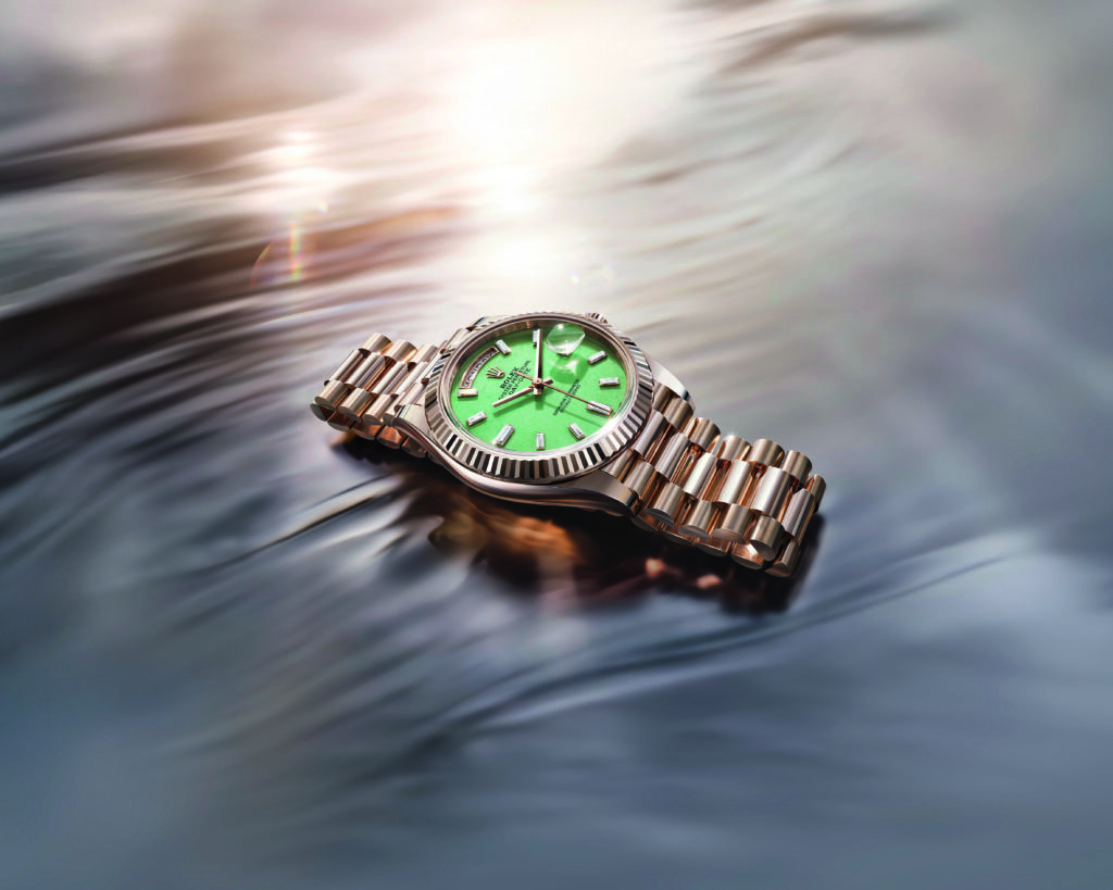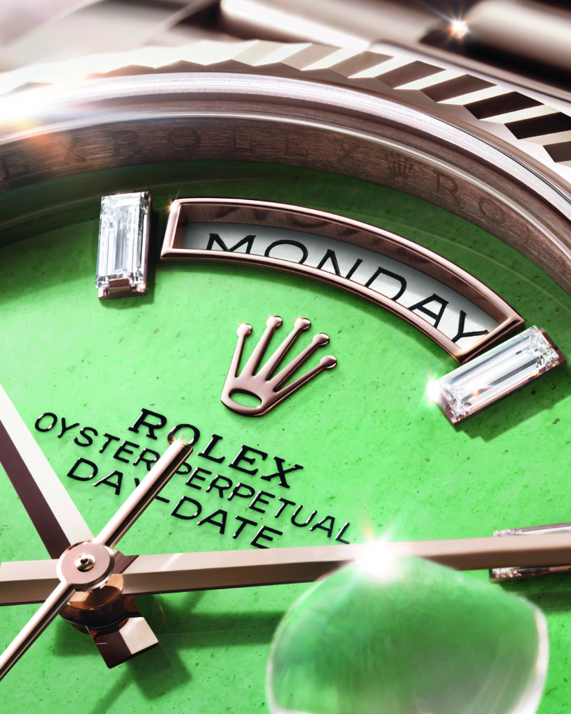 搭配這種全新合金的,是亮綠東陵石錶面以及 10 顆長方形鑽石時標。這個組合其實很有意思:一方面,Jubilee Gold 的顏色比一般黃金來得含蓄,天然石材錶盤亦令整體更有自然質感;但另一方面,鑽石時標與 Day-Date 本身的象徵性,又令這枚腕錶始終保留那份「元首之錶」應有的氣場。
