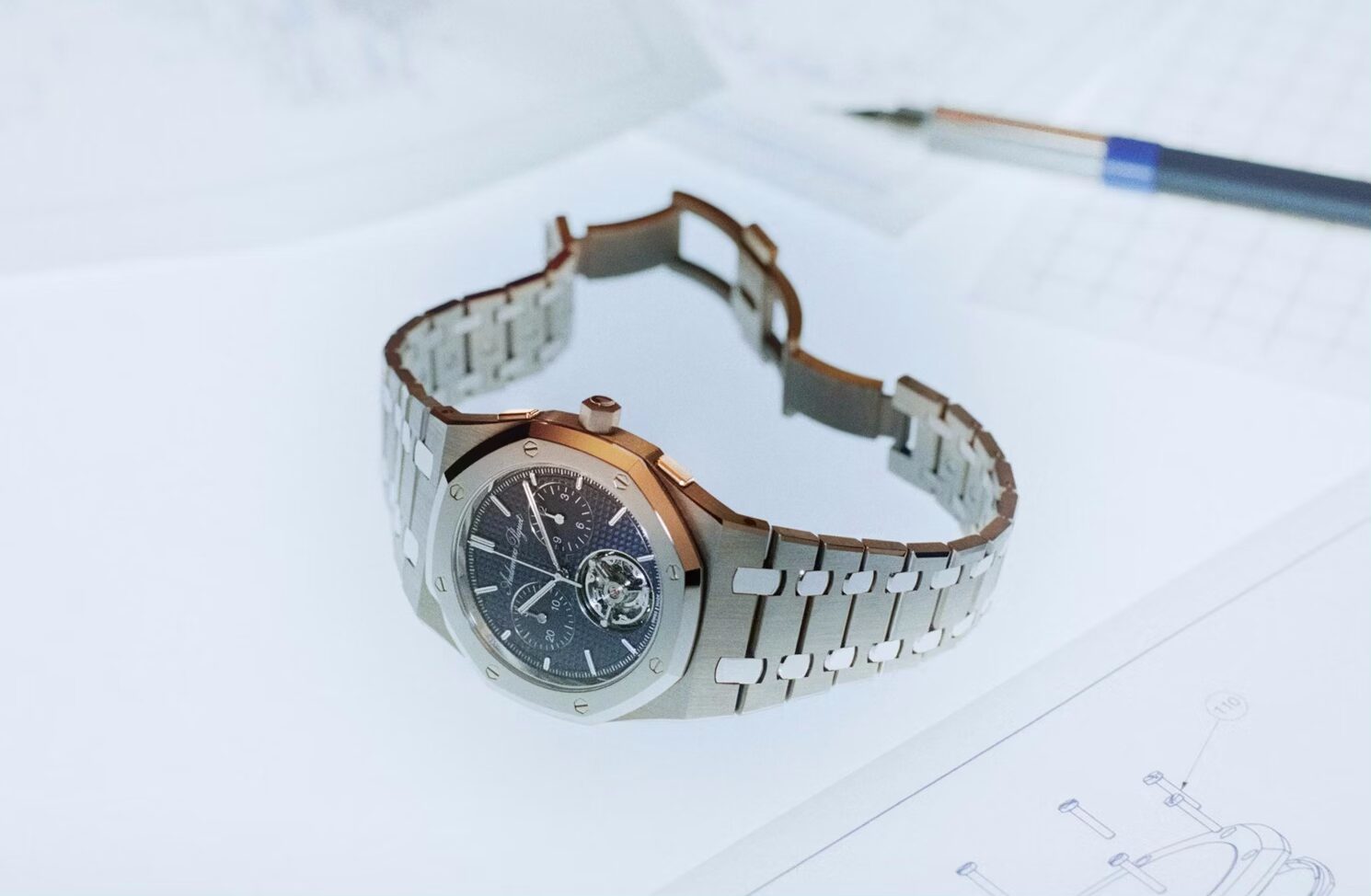 Audemars Piguet RD 系列最終之作 Royal Oak「Jumbo」Extra-Thin Selfwinding Flying Tourbillon Chronograph RD# 5,限量推出 150 枚,作為 Audemars Piguet R&D 系列的收官之作,這款 150 週年紀念版「Jumbo」由製錶團隊依據人體工學精心設計,打造出舒適佩戴體驗的錶殼。